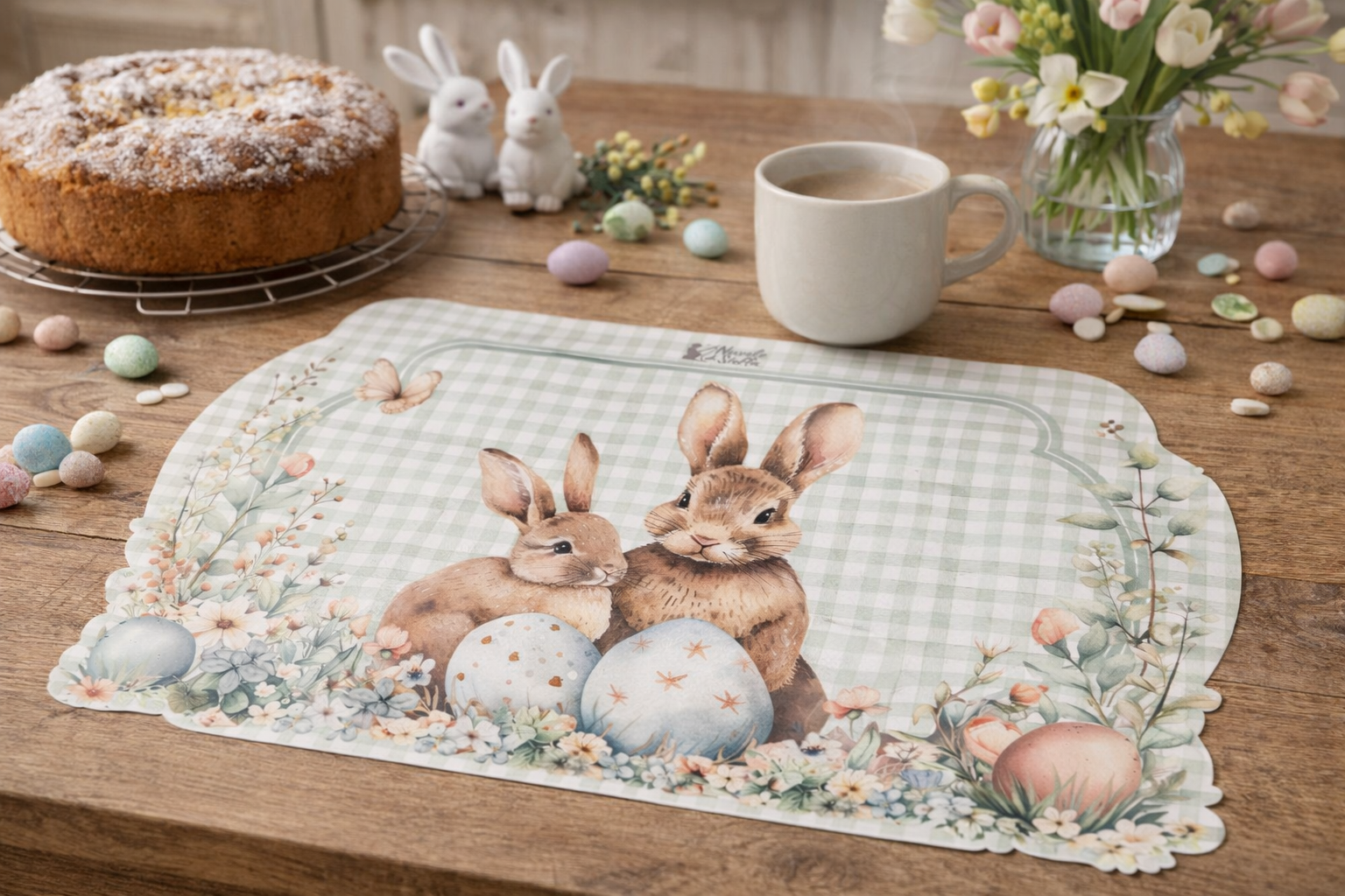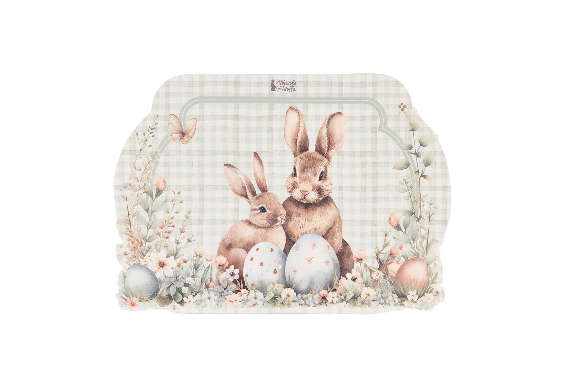 Tovaglietta americana in vinile 49 × 35 cm della collezione Pepen di Nuvole di Stoffa, perfetta per unire praticità e stile pasquale. Decorata con il delicato fondo a quadretti verde salvia, con teneri coniglietti, uova decorate e fiori primaverili dai toni pastello, porta in tavola un’atmosfera dolce e luminosa.