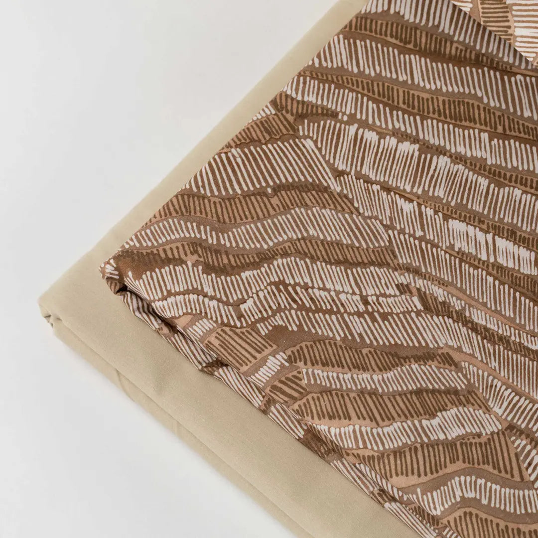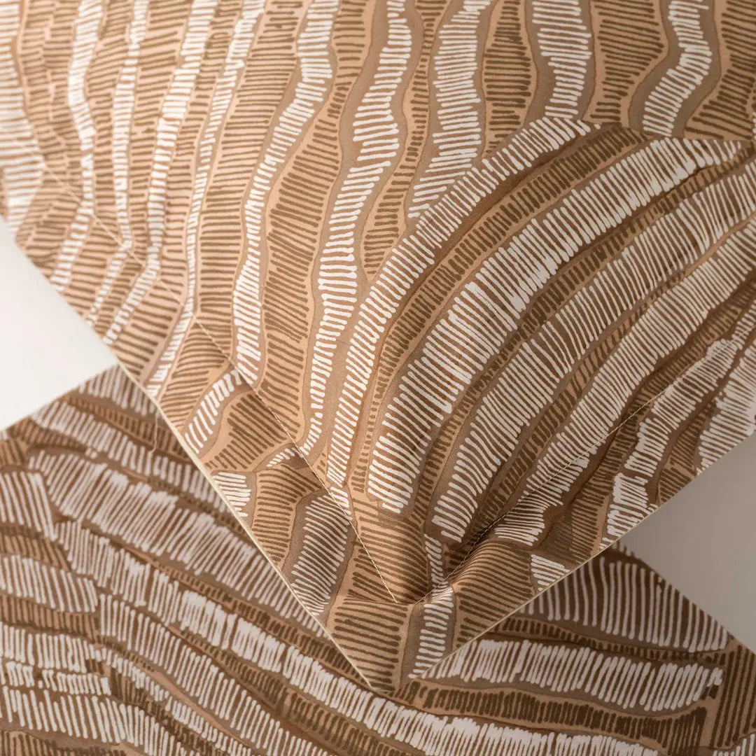 Il completo letto Cody è pensato per chi desidera un’eleganza naturale e materica, capace di arredare con carattere anche attraverso i dettagli più discreti. Il motivo grafico, ispirato alle venature della natura e stampato in digitale su fondo ambra, crea un effetto visivo caldo e avvolgente, perfetto per dare profondità alla zona notte senza appesantirla.