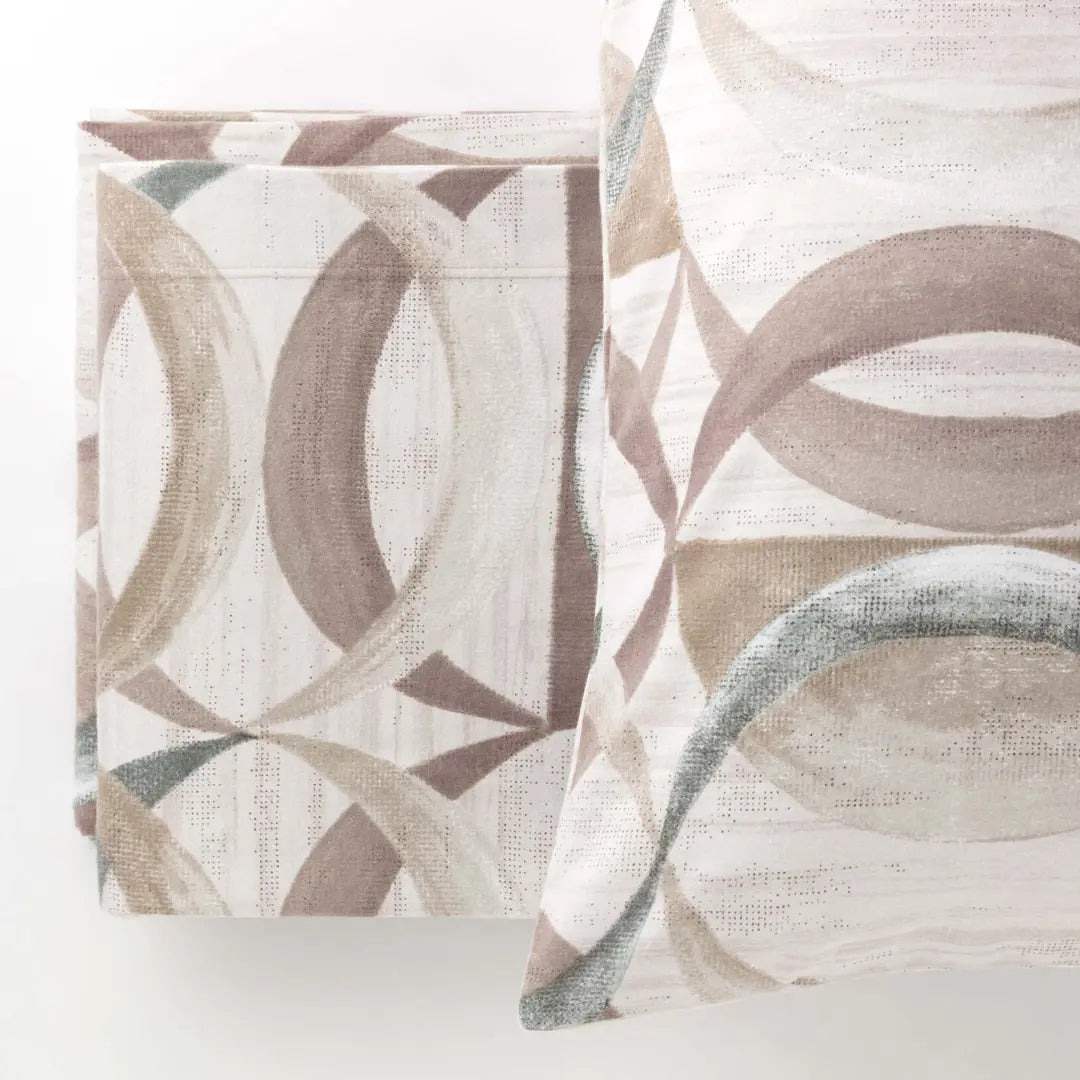 Il disegno a cerchi sovrapposti, ripetuto con equilibrio su lenzuolo e federe, conferisce movimento e personalità alla biancheria. Disponibile nelle tonalità Beige, Cipria e Ottanio, si adatta facilmente a diversi stili d’arredo: dalle camere più neutre fino agli ambienti con accenti di colore.