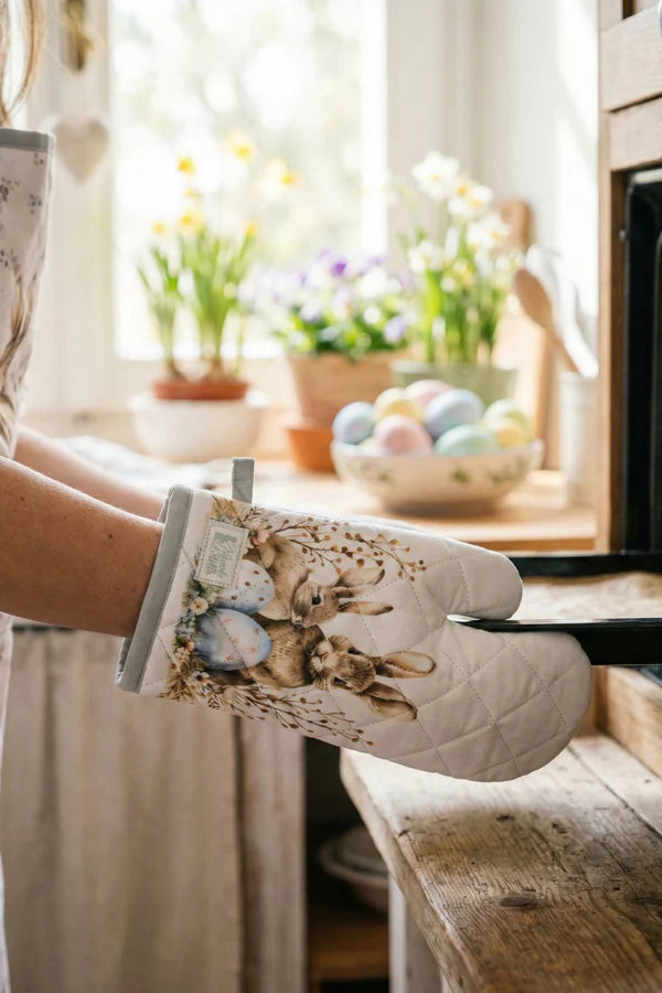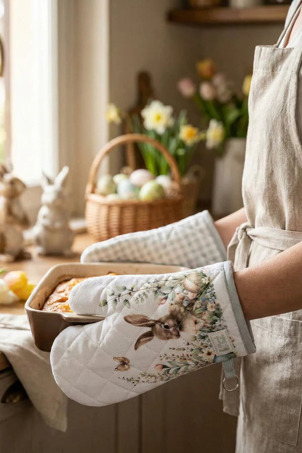 Guantone da forno in cotone, con anello in metallo per appenderlo.