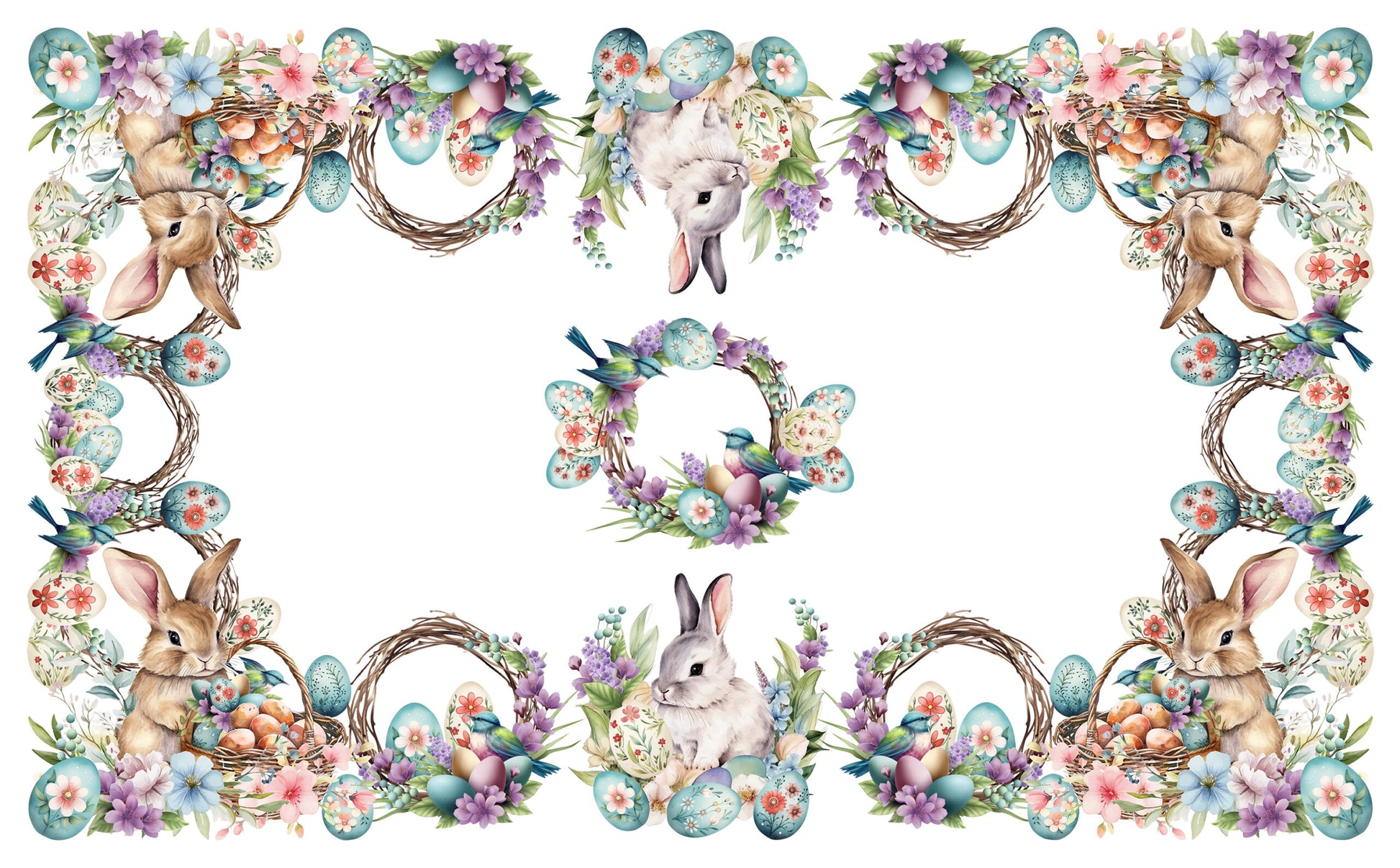 Il disegno alterna coniglietti e uccellini colorati a ghirlande di ramoscelli intrecciati, creando una composizione ricca ma equilibrata, piacevole da guardare anche quando la tavola è apparecchiata. I dettagli – uova decorate con motivi floreali, piccoli nidi e fiori di campo – rendono la grafica viva e curata, senza risultare eccessiva.