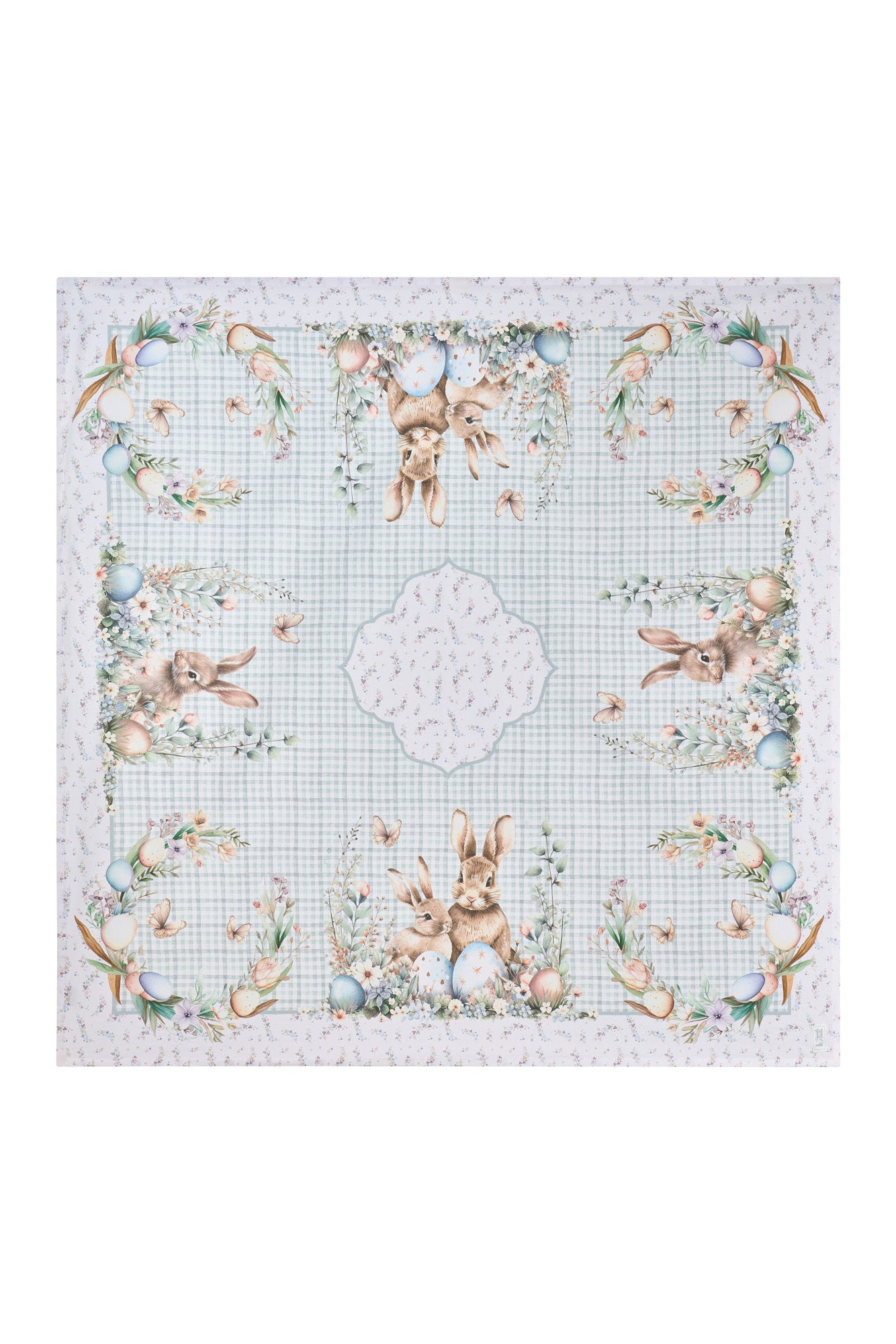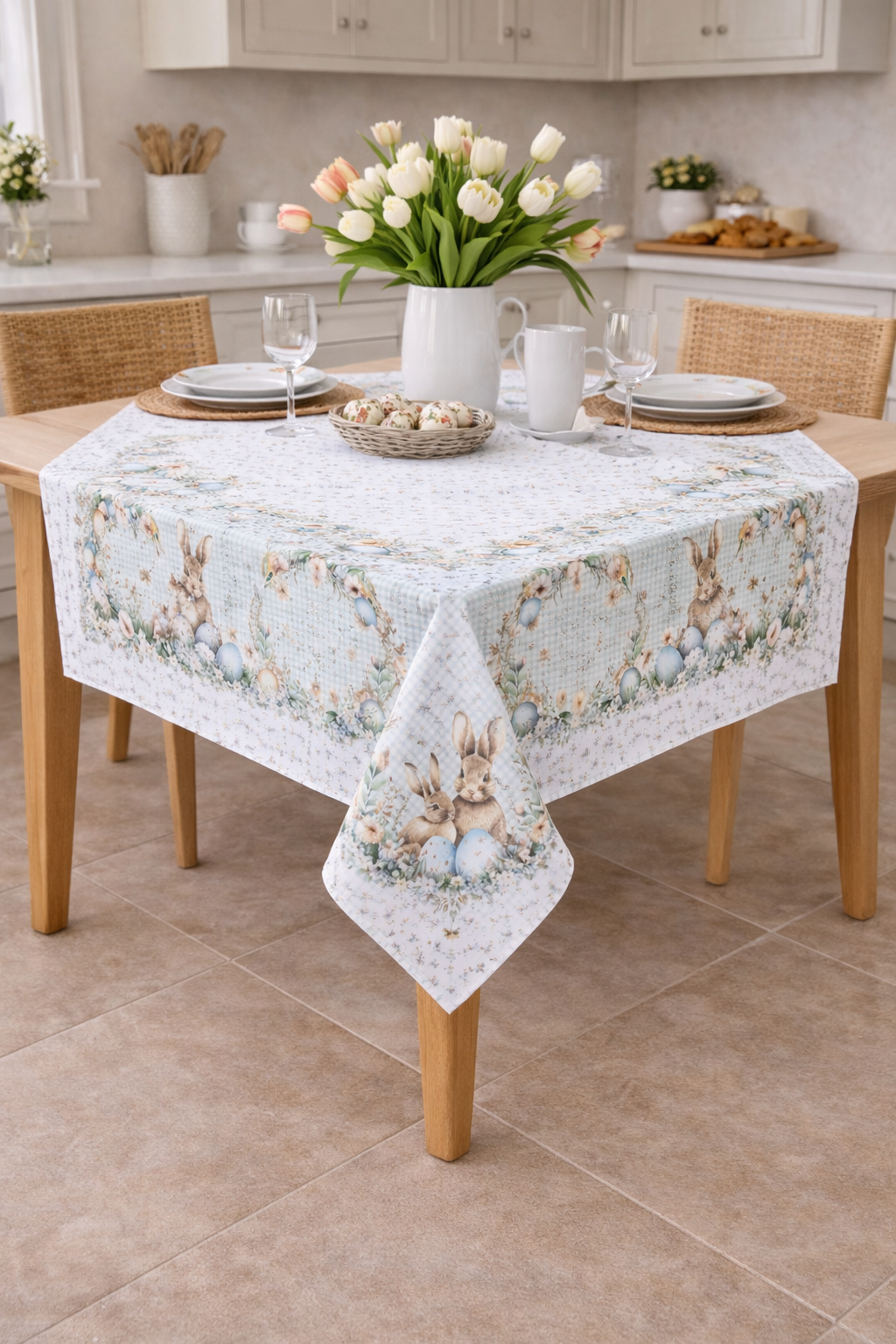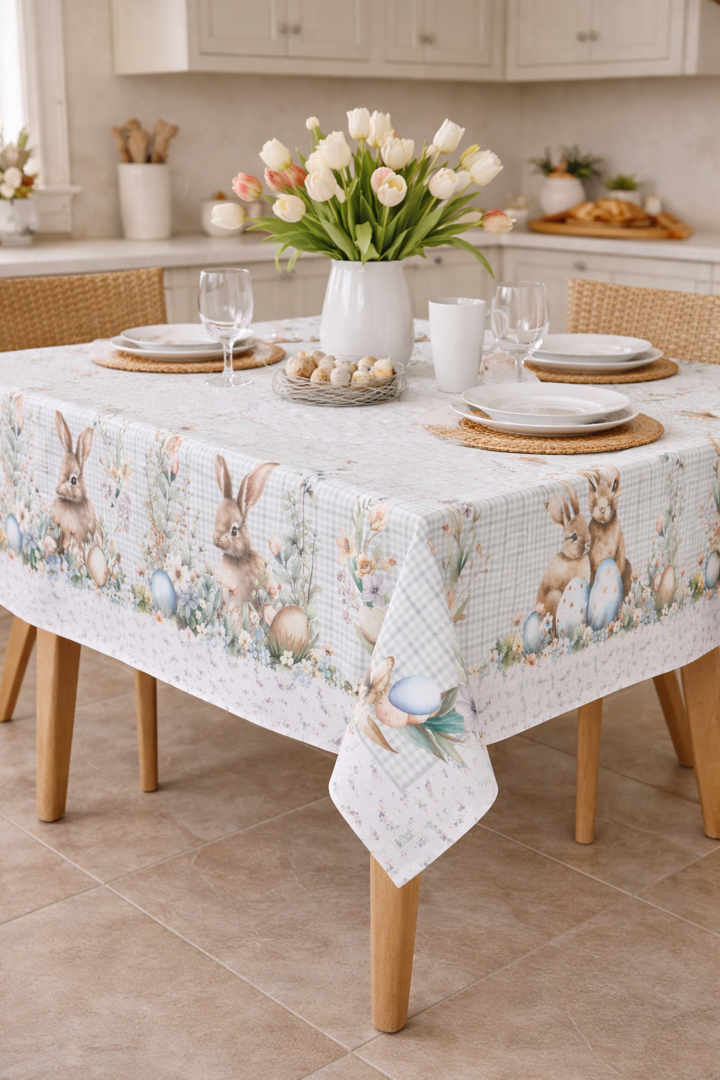 Tovaglia da tavola in 100% cotone, delicata nei toni ma ricca nella fantasia caratterizzata da dolcissimi coniglietti e decorazioni floreali.