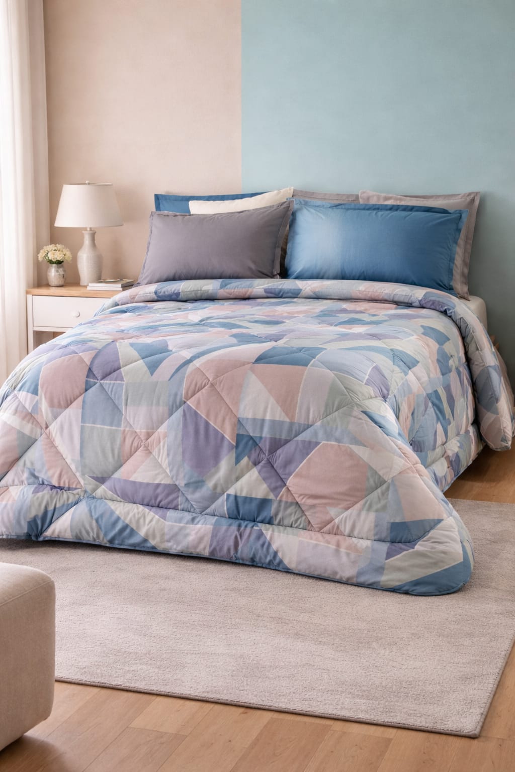 Con il suo disegno geometrico a rombi, la trapunta percalle Brody si distingue per l’eleganza sottile di un geometrico in chiave contemporanea. Le ampie campiture di colore danno al tessuto un dinamismo sofisticato, capace di trasformare ogni camera da letto in uno spazio accogliente e ricercato. La lavorazione con stampa digitale su percalle 100% cotone garantisce una resa cromatica nitida e durevole, mentre l’imbottitura da 350 GSM in poliestere assicura il giusto equilibrio tra calore e leggerezza.
