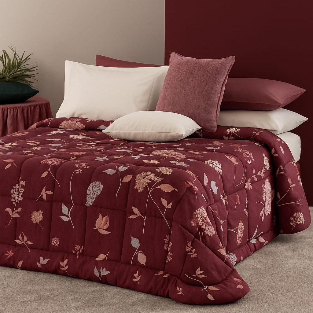Il velluto del lato frontale, impreziosito da una stampa digitale ad alta definizione, regala una sensazione tattile calda e avvolgente, mentre il retro in puro cotone accoglie la pelle con naturale morbidezza. L’imbottitura generosa da 350 grammi per metro quadro garantisce un comfort ideale durante le notti più fredde, senza appesantire. La trapuntatura a quadri con cornice disegna un ritmo discreto e sofisticato, valorizzato dagli angoli stondati che aggiungono un tocco di delicatezza alla versione matrimoniale da 260x270 cm.