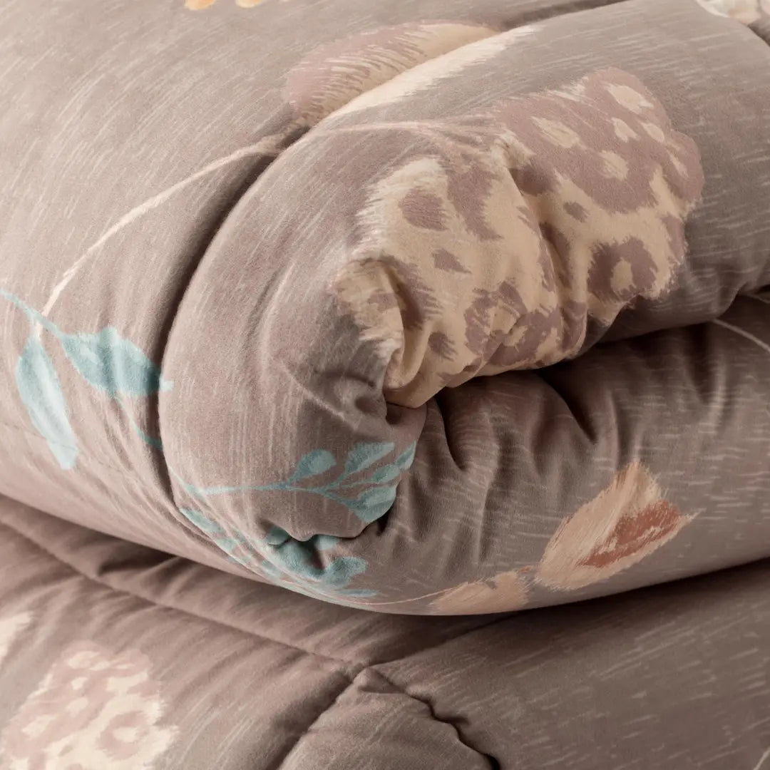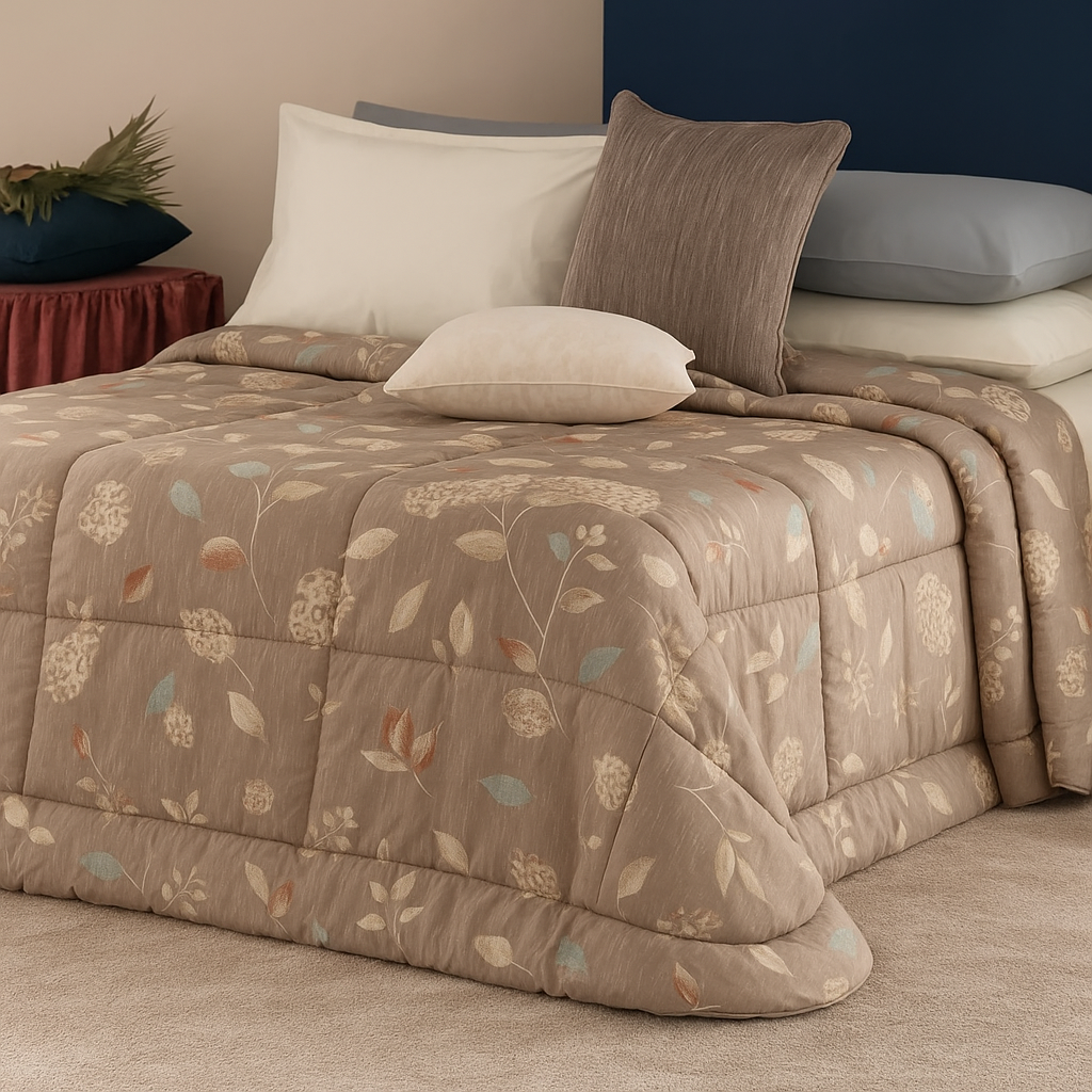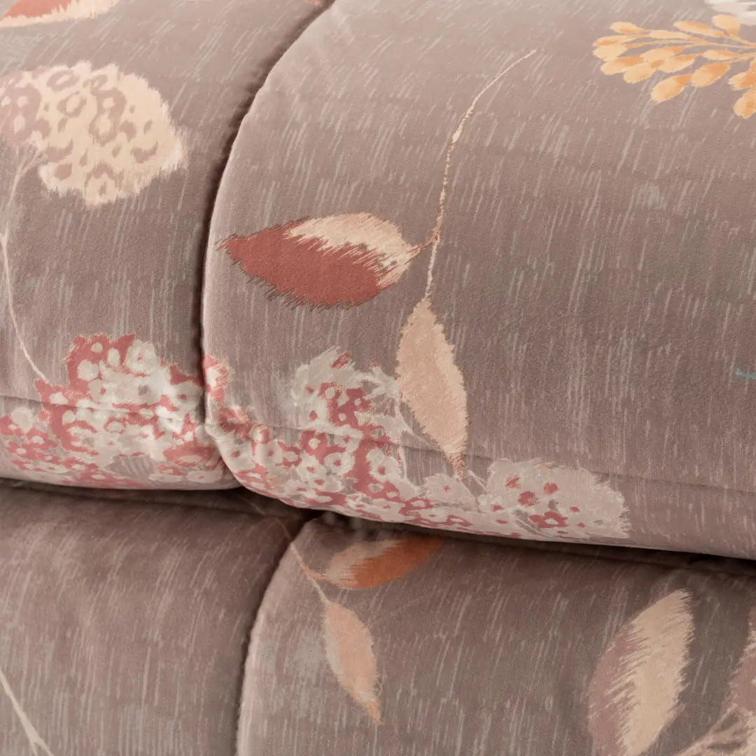 Il velluto del lato frontale, impreziosito da una stampa digitale ad alta definizione, regala una sensazione tattile calda e avvolgente, mentre il retro in puro cotone accoglie la pelle con naturale morbidezza. L’imbottitura generosa da 350 grammi per metro quadro garantisce un comfort ideale durante le notti più fredde, senza appesantire. La trapuntatura a quadri con cornice disegna un ritmo discreto e sofisticato, valorizzato dagli angoli stondati che aggiungono un tocco di delicatezza alla versione matrimoniale da 260x270 cm.